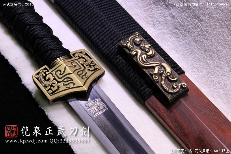 作品锻造工艺说明:手工折叠锻打花纹刀剑,特别加硬加强刀剑,覆土烧刃,折叠锻打32000余层,夹钢复合,上研研磨工艺,硬度:60度
