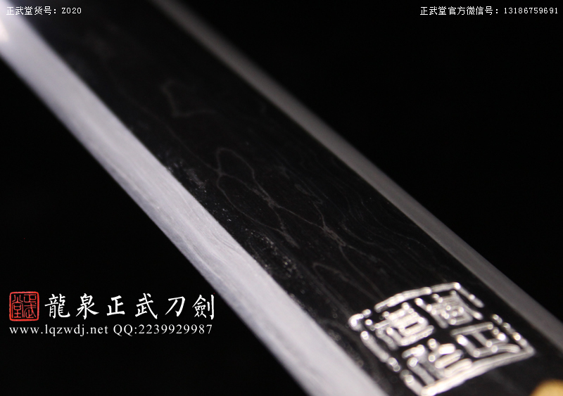 作品锻造工艺说明:手工折叠锻打花纹刀剑,折叠锻打16000余层,夹钢复合,刃身采用中等研磨工艺,硬度:58度。