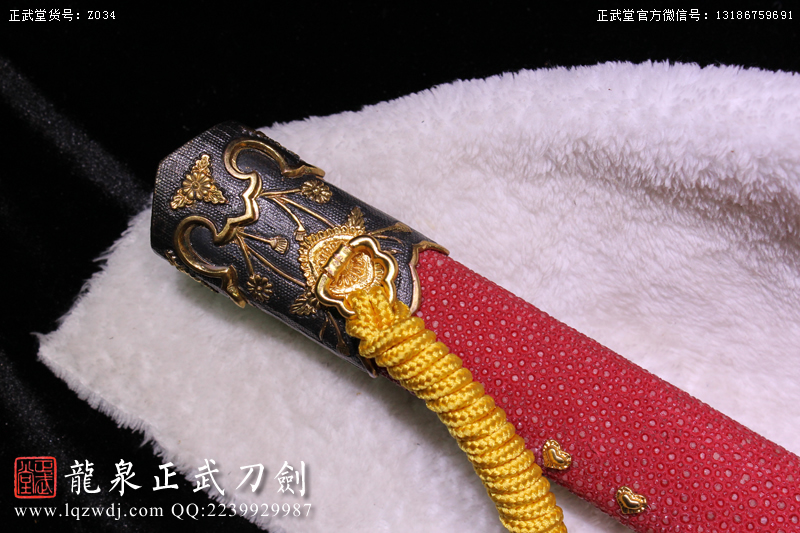 尺寸:全长:107;刃长:77; 柄长:26; 刃宽:3.2; 刃厚:0.8;红鱼皮鞘、柄;装具为铜装;