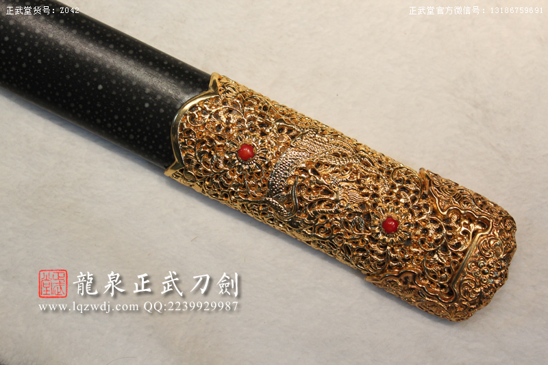 作品名称:手锻包钢地肌烧刃八龙式本色装黑鱼皮鞘切刃造唐刀